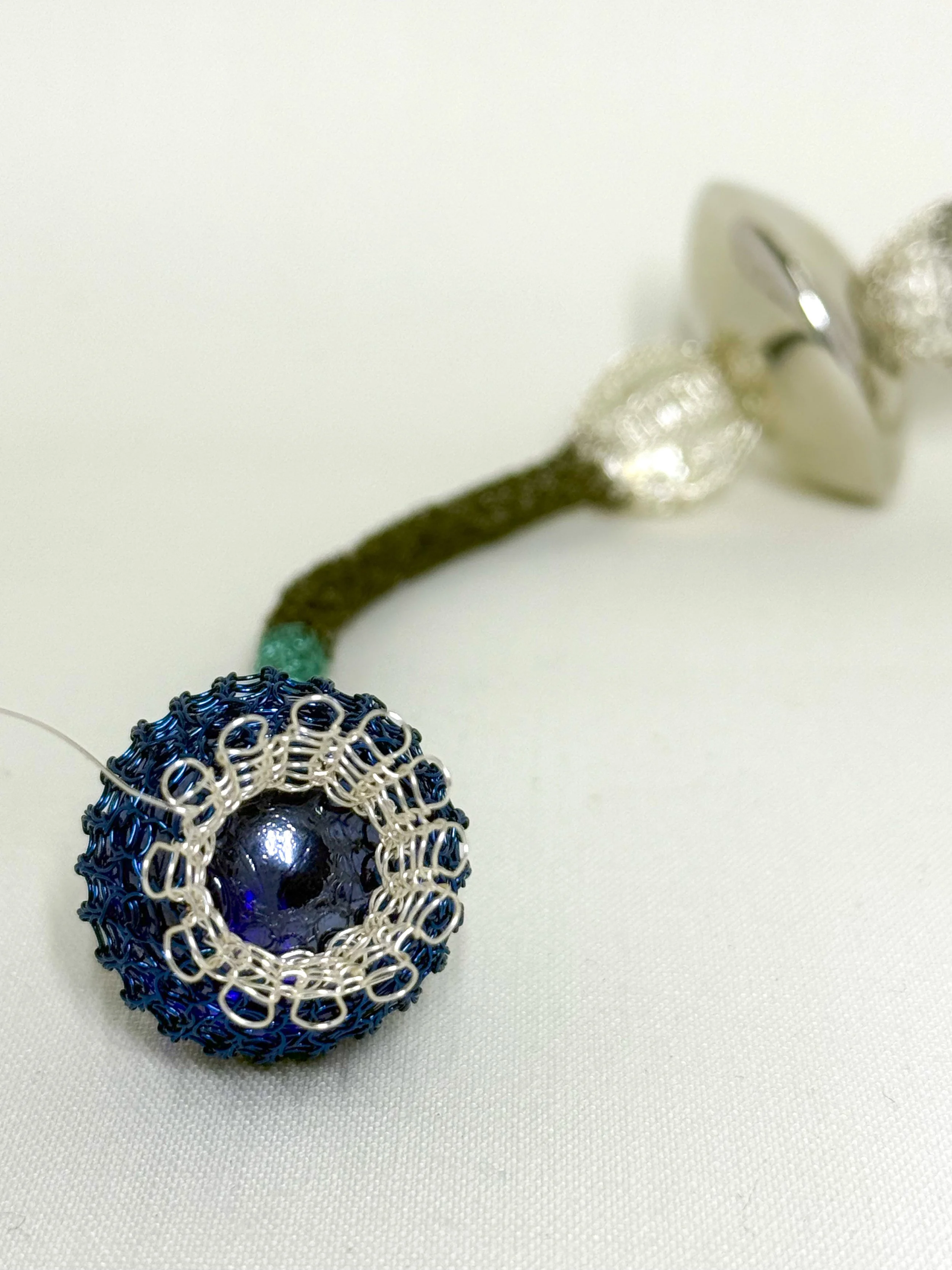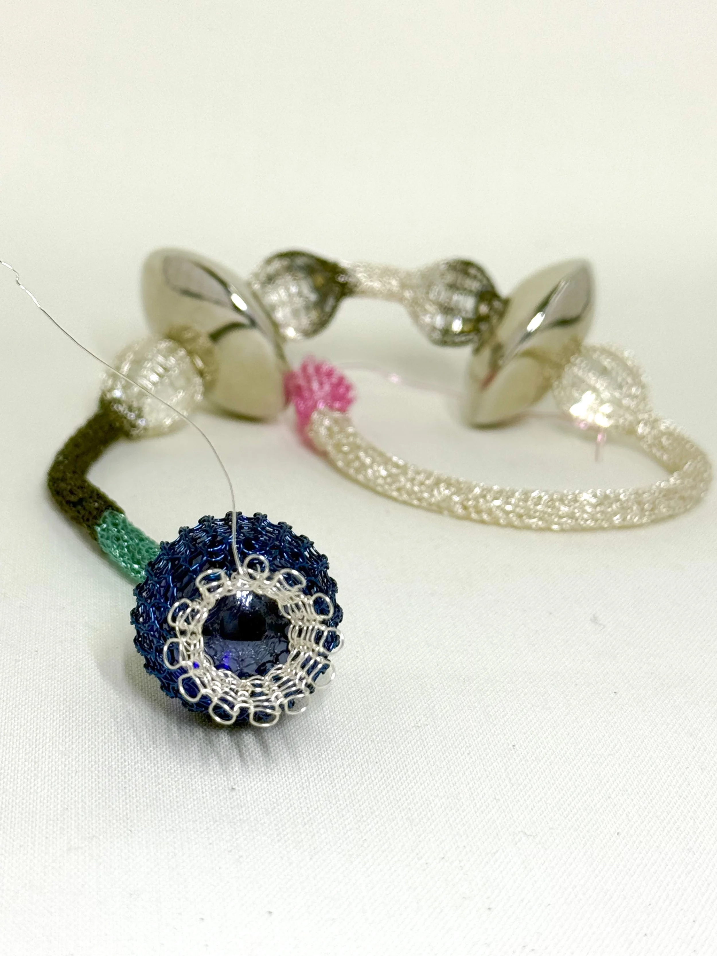 2 July WATER. With my evolving crochet form I sought to represent water as a vital resource, precious and rare gem. I selected a deep sapphire coloured marble, reminiscent of a perfectly spherical water drop, its surface evoking the stillness and mystery of a secluded pool, an inviting space of reflection and immersion. By leaving part of the marble uncovered I reveal its richness and draw attention to the contrast between the glass and the deep blue wire that cradles it. This wire acts as a metaphor for support and care, holding and nurturing the marble as we must hold and nurture our access to clean water. The work is a meditation on gratitude for the privilege of clean, life sustaining water and a reminder of its fragility and value.